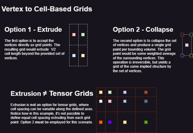 Grids can be defined by cells or vertices. When importing vertex-based 2D/3D regular grids, a conversion to cell-based regular grids will take place. The grid size is extended by one along each axis, and the vertex data is imported as grid points. The resulting grid/voxel will extrude 1/2 cell length along each axis (see "Option 1" in the attached illustration below).
