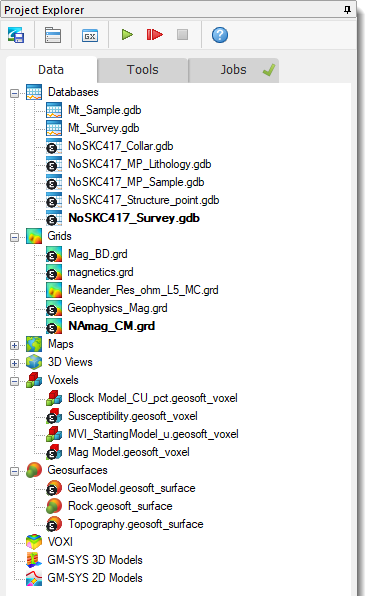 Successfully imported datasets are stored in the current project folder and automatically added to the Data tab in the Project Explorer. Their icons will display a modified version, featuring the Seequent Evo symbol, indicating successful import from Seequent Evo.