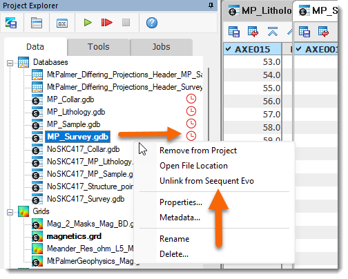 will appear next to the dataset in the Data tab, and a new context menu option, Unlink from Seequent Evo, will become available.