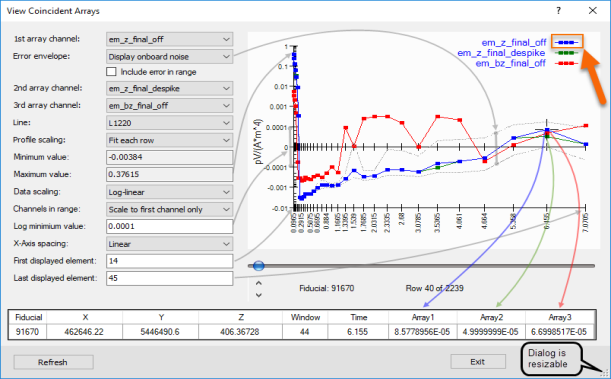 Use the EM Utilities > View Coincident Arrays (VCA) interactive tool (geogxnet.dll(Geosoft.GX.EM.MultipleArrayChannelProfileViewer;Run)*) to display up to three coincident arrays.