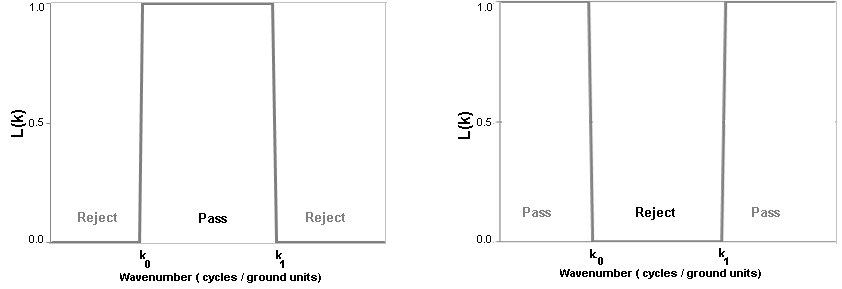 The bandpass filter (BPAS) can be used to pass or reject a range of wavelengths contained in the data. However, applying such a simple cutoff filter operator to an energy spectrum almost invariably introduces a significant amount of oscillation (also known as Gibbs’ Phenomenon). This filter is present for the sake of completeness. We recommend that you use a tapered filter such as the Butterworth filter (BTWR).