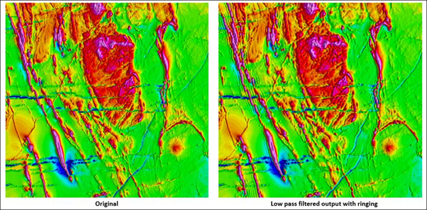 Original magnetic data (left), low pass filtered magnetic data with ringing (right)