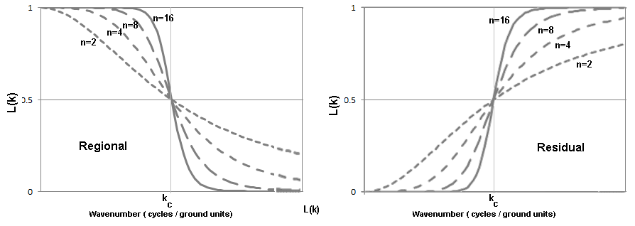 The Butterworth filter is excellent for applying straightforward high-pass and low-pass filters, in particular because if allows you to control the sharpness of the filter around the wavelength cutoff. Many other low and high pass filters result in “ringing” (Gibbs phenomenon) in the output, because they have a sharp “cut-off” either side of the cutoff wavelength. Ringing generally manifests as “waves” emanating from the edges of high amplitude anomalies (see below).