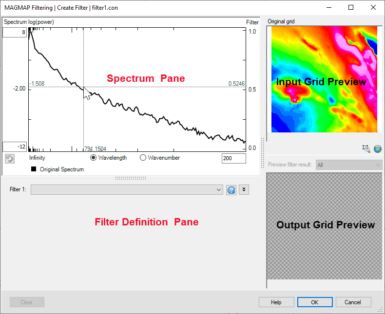 Use the interactive filter design dialog to define the Fourier domain filters and to interactively preview the original grid and the filtered grid(s). If the filter file provided in the MAGMAP Filtering dialog is a pre-existing filter control file (*.con) , the filter values stored in that file will be loaded by default in this dialog. Filter parameters can then be interactively modified to obtain the best results for your data.