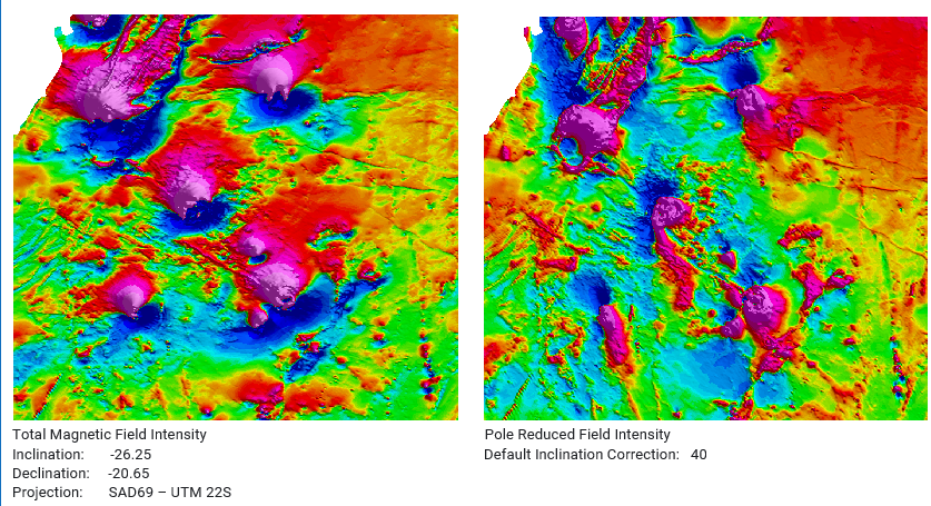 Reduction to Pole has an amplitude component (sin(I)) and a phase component (i cos(I) cos(D-θ)). When reducing to pole from near-equatorial latitudes, in the vicinity of the declination azimuth, the filter becomes unstable, producing strongly dominating trends that would obstruct real features. The problem is attenuated by specifying a modulating inclination angle Ia. This is at the expense of under-correcting the amplitudes of features along the declination direction.