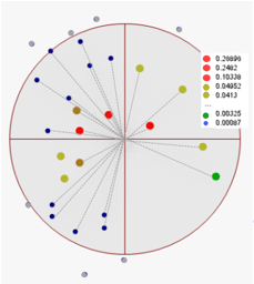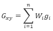 The normalized weights (legend) of all gi data points (indicated within the search radius) are calculated. Points outside the search radius are ignored. Then, equation Gxy=∑ni=1Wi gi is applied.