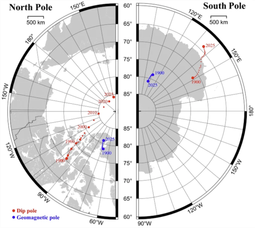 The illustration below depicts the motion of the geomagnetic north and south poles since 1900.