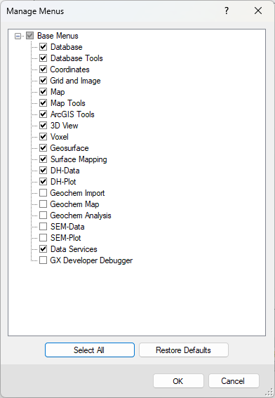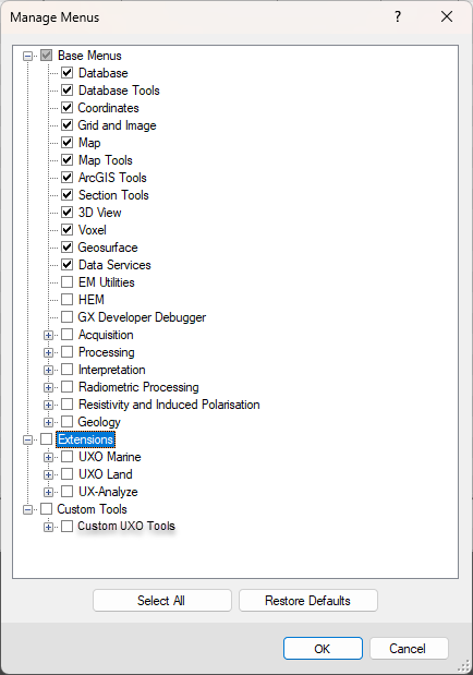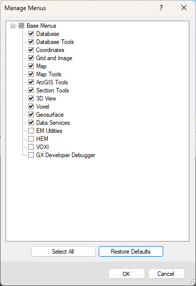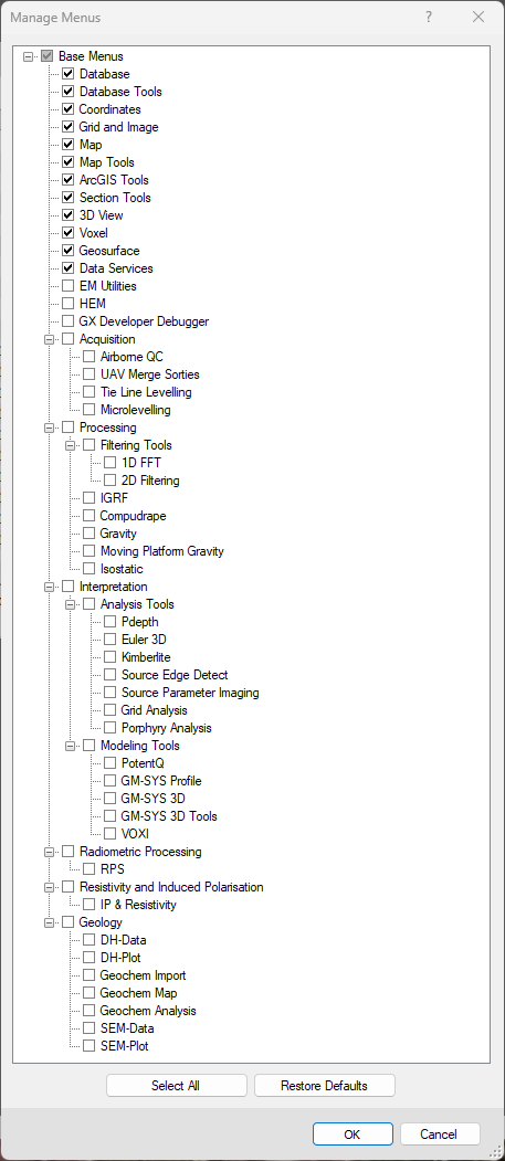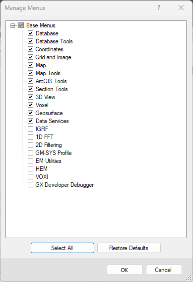 The Manage Menus interface in Oasis montaj or Target helps you identify which features are available based on your subscription and entitlements. It also allows you to customize menus and workflows on a per-project basis (GPF), reflecting the product naming and structure associated with your license.