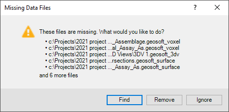 The Missing Data Files dialog appears when launching a project that contains documents previously open in the project but now missing. The last known paths of the first five "lost" files will be displayed in the dialog, and any additional missing files will be reported.