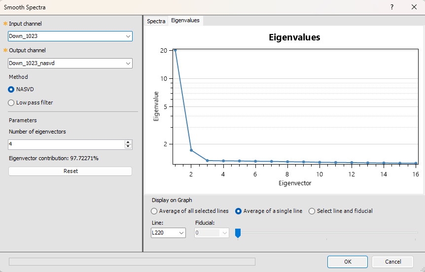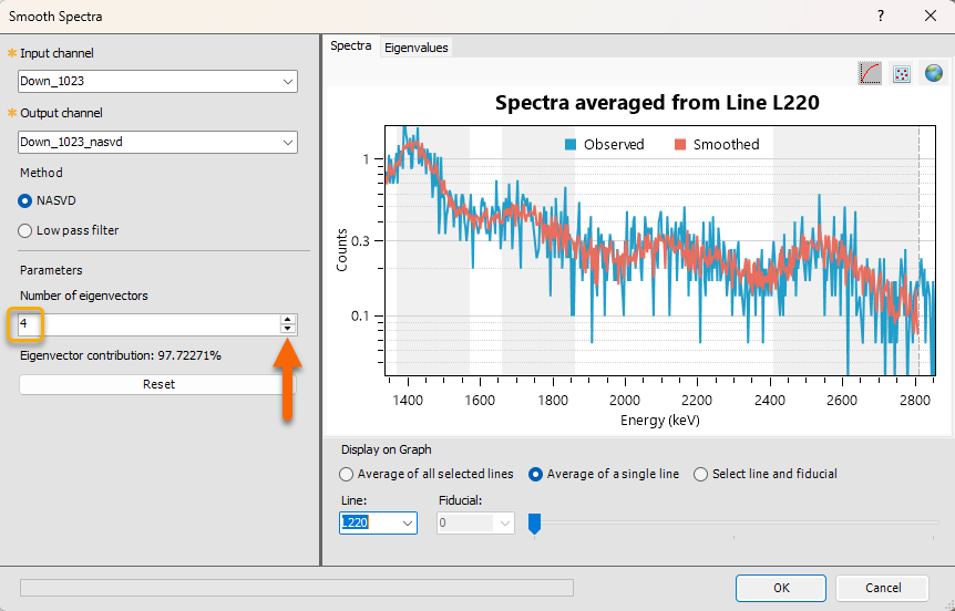 • Once you are satisfied with the selected number of eigenvectors and the quality of the filtered signal, click OK to apply the smoothing to the output radiometric channel.