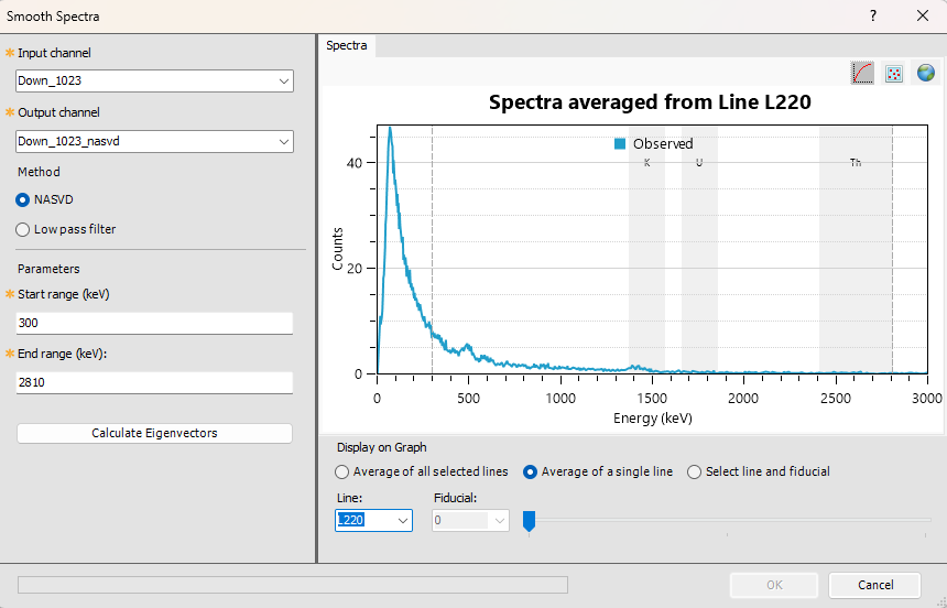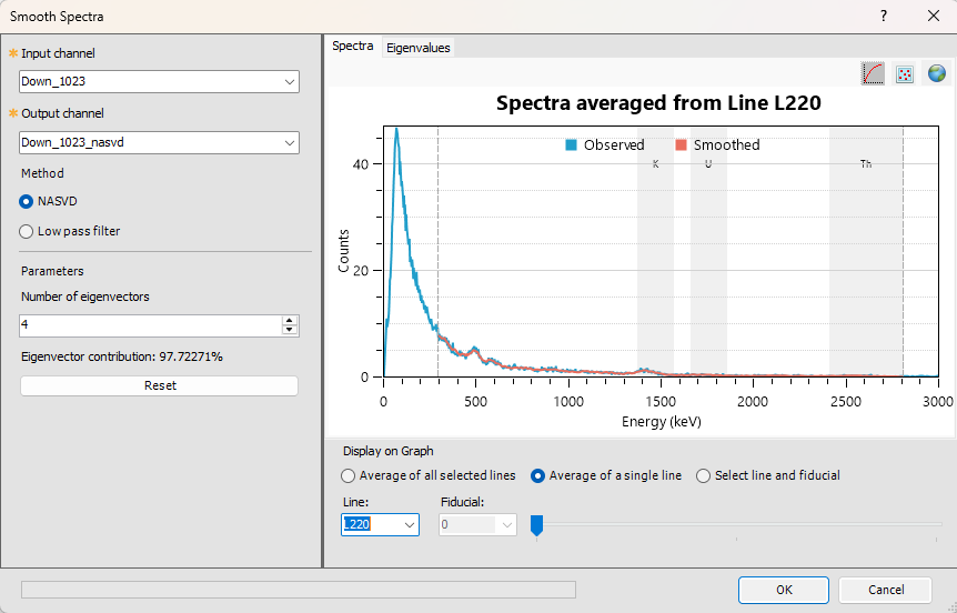 The RPS > Smooth Spectra option (geogxnet.dll(Geosoft.GX.Radiometrics.SmoothSpectra;Run)*) is an interactive tool for averaging and smoothing spectral radiometric data to improve the signal-to-noise ratio. Smoothing can be applied to a single line or to all selected lines in the database. The tool supports both NASVD and low-pass filtering, and includes eigenvalue/eigenvector analysis for optimal spectral reconstruction.