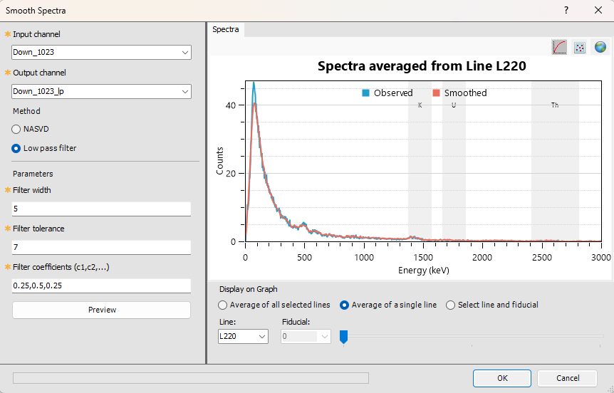 To smooth your data using a low-pass filter, select the Low pass filter option, adjust the filter parameters, and click Preview. The graph will update to show smoothed spectral counts for Potassium (K), Uranium (U), and Thorium (Th)