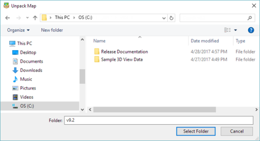 An Unpack Map browse dialog opens enabling you to select the folder to place the unpacked files.