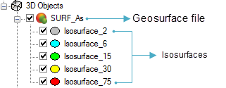 After the geosurface has been added to the 3D Viewer, the 3D Objects tree list will show the geosurface file name as the top level and below that, the surfaces within the geosurface.