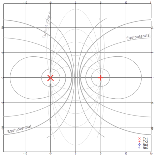 Given a good current flow between two transmitters placed on a homogeneous subsurface, the equipotentials will be distributed as indicated by the heavy grey lines in Figure 1. If two receiver electrodes are located on or near the same equipotential, there will be a negligible potential difference between them. Such a geometry is said to be "Null Coupled".
