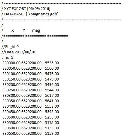 Geosoft XYZ data (*.xyz) is ASCII positional data defined by locations (X and Y) and a data value (Z) in a line format. Line numbers are provided on a separate line preceding the actual data, which is arranged in columns.