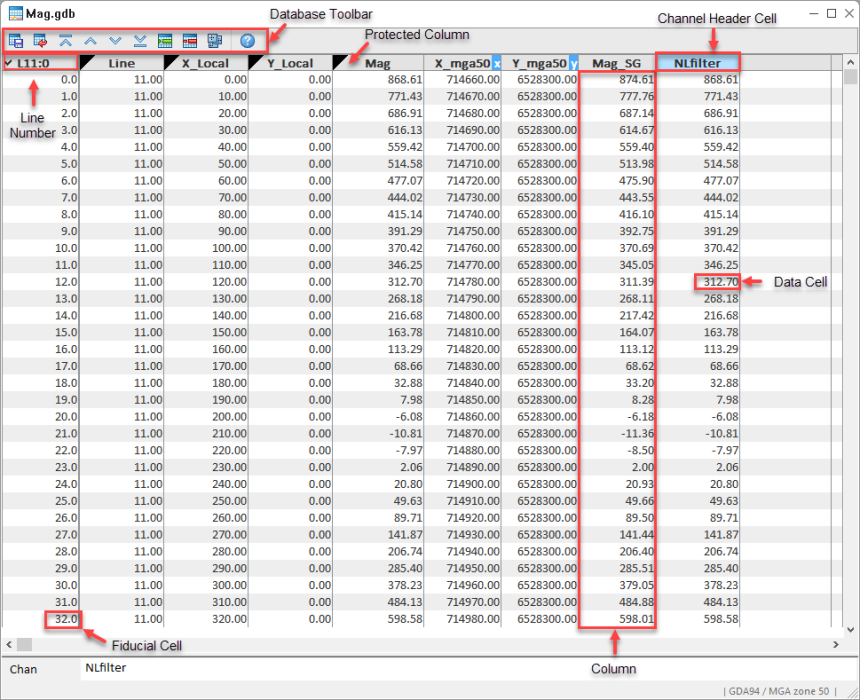 The spreadsheet window is organized in rows, columns (channels), and lines (also called groups in other applications such as drillhole plotting). Rows and columns work similarly to standard spreadsheets in that you can edit and delete them as needed. The system enables multiple "pages" in your database – depending on the type of data you are working with (line, random line, or drillhole); the worksheets have different names. To see what type of name is used, look at the ID cell in the top left corner of the spreadsheet. An "L", for example, indicates that you are working with line data.
