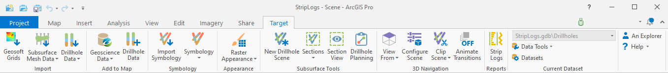 Installing Target for ArcGIS Pro will add a new ribbon to your ArcGIS Pro application, called "Target".
