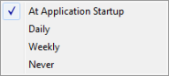 Select the frequency at which you want the system to check for updates. Your selection will have a check mark next to it. The default is "At Application Startup".