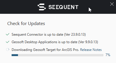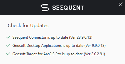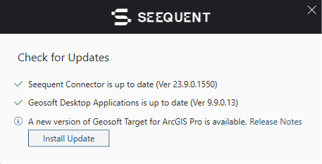 You can check for software updates at your own convenience and set your update options using the Seequent Connector. By default, Target for ArcGIS Pro automatically checks for updates when it is opened.