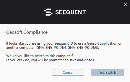 - The compliance dialog will also be presented if you sign in (with your Seequent ID) and open a Target for ArcGIS Pro project on a second computer, while another Geosoft Seequent licensed product or online service is open on your primary computer.