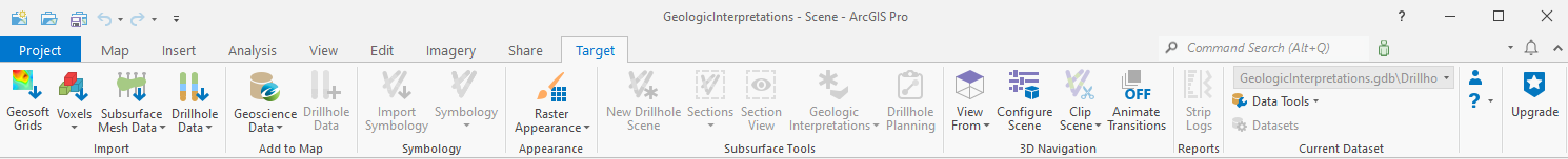 If no license is present, the drillhole-related tools in the Target ribbon tab will appear disabled (or grayed out) and the Upgrade button will be visible.