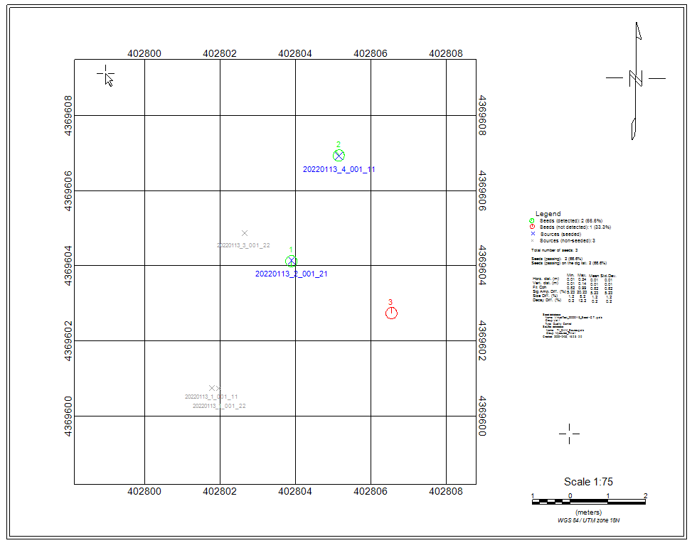 - Seeds_Detected (Pass): green circle symbol rotated to match the calculated seed-source azimuth and labeled with the Seed Id