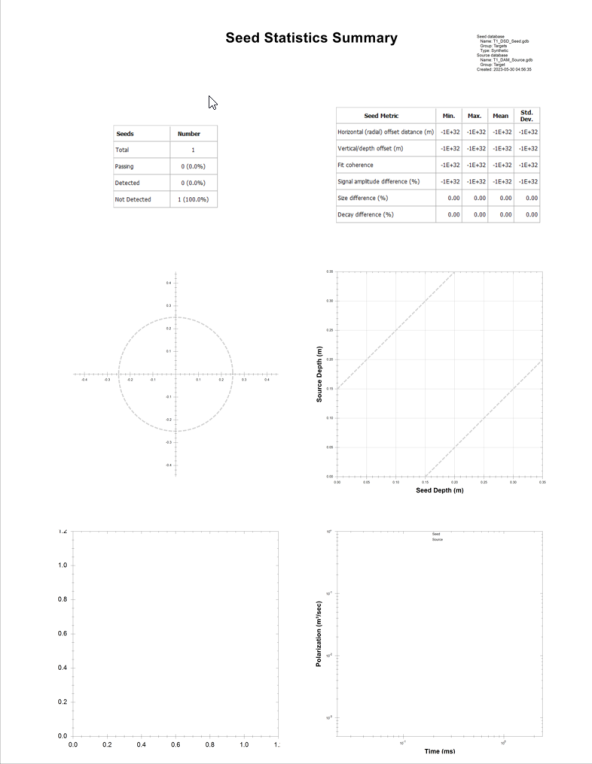 Use the Calculate Seed Statistics option (Geosoft.uxo.gxnet.dll(Geosoft.GX.UXO.UxaCalculateSeedStatistics;Run)*) to generate statistics by comparing seed and source databases based on a set of source metrics and defined thresholds. You can plot a detailed report of the statistics, display the summary statistics on a map, or save the seed statistics to a report (CSV) file. The tool can be used both individually with physical seeds or in conjunction with synthetic seeding.