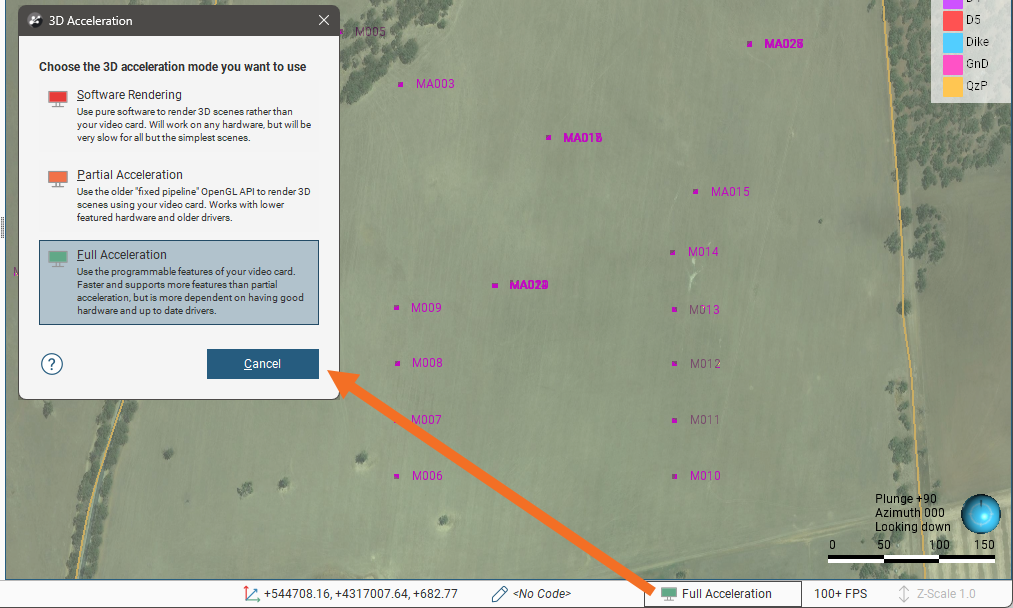 The quality of the scene display is determined by the acceleration mode selected. To change the acceleration mode, click the button at the bottom of the Leapfrog Viewer window: