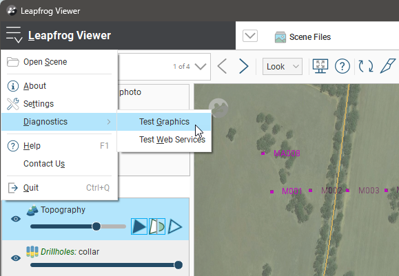 You can also test the capabilities of your computer’s video card by running the graphics test. Click on the Leapfrog Viewer menu and select Diagnostics > Test Graphics: