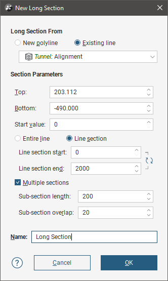 If the long section is to be a single section along the reference line, untick Multiple sections. For longer lines, it is often useful to tick Multiple sections and divide the line into multiple sections. Use Sub-section length to control how much of the line appears in each section, and Sub-section overlap to specify the amount (if any) on each section that is duplicated on the adjacent section.