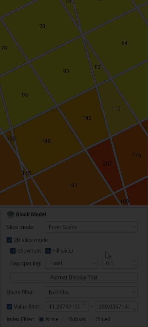The Show text option provides the choice between seeing a value on screen for each block intersecting the slicer, or not. The default value is the value for the column selected to colour the block model: