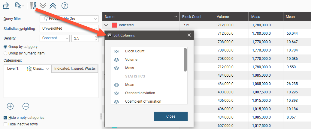 You can view statistics for all evaluations and calculations made on a block model broken down into categories and organised by numeric evaluations and calculations. To view statistics, right-click on a block model in the project tree, select Statistics then select the Table of Statistics option.