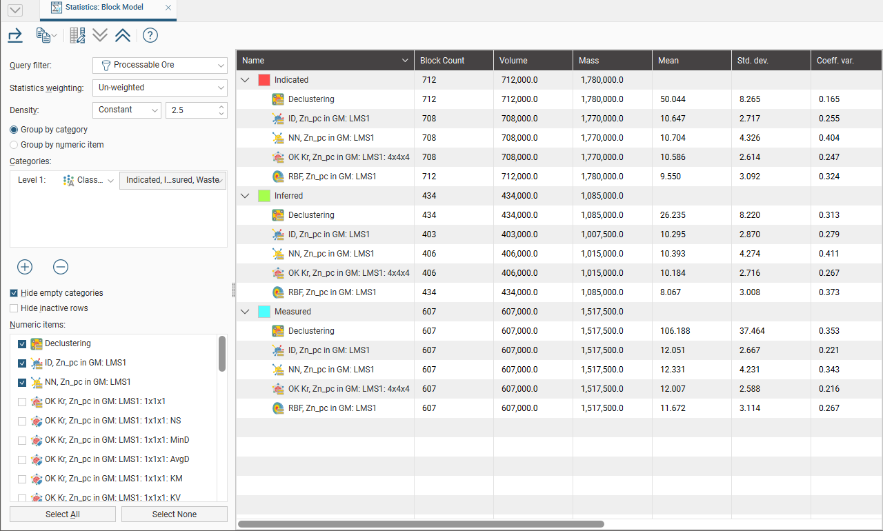 To view statistics on a block model, right-click on the model in the project tree and select Statistics. The following options are available: