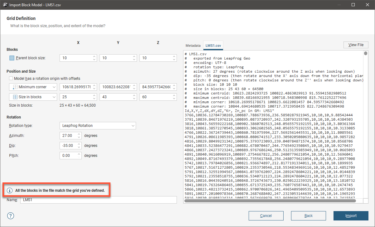 If you are opening a block model *.csv file created by Leapfrog, the Grid Definition fields will be automatically populated.