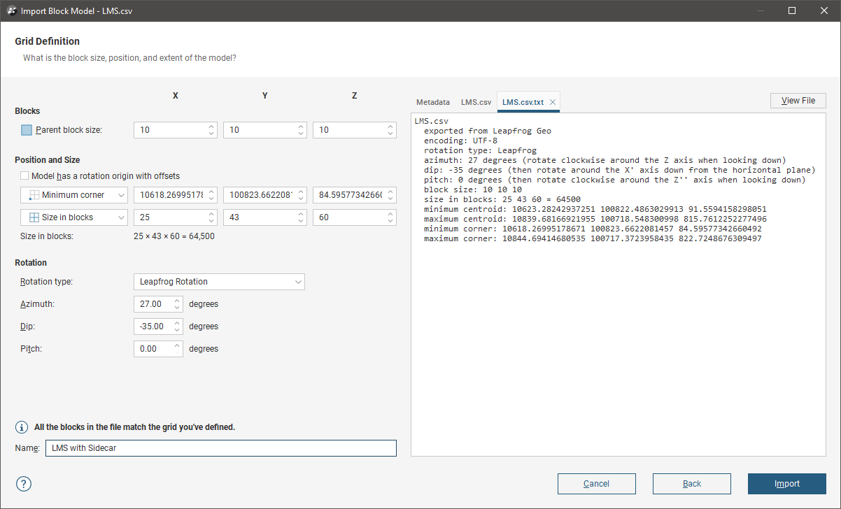 Some *.csv block model files do not have the file grid definition data in a header at the top of the file, but instead have the information in a second 'sidecar' file that accompanies the block model file. If no grid definition header is apparent for the file you have selected, check the source folder to see if there is another file that contains the grid definition information. If the block model was exported from Leapfrog Works, the file will be named the same but also have “.txt” at the end. If Leapfrog Works can identify the sidecar file it will be displayed in a tab on the right side of the window.