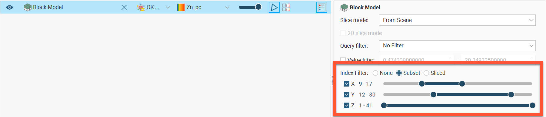 When a block model is displayed in the scene, there is an Index Filter option for displaying the grid: