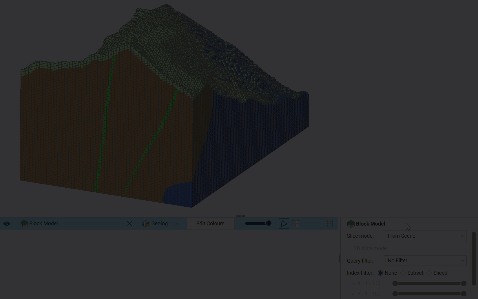 Block models can also be added to a section layout where they will have an appearance similar to the 2D slice mode view. This presentation option includes a query filter and an index filter. See Section Layouts for more information on designing section layouts.