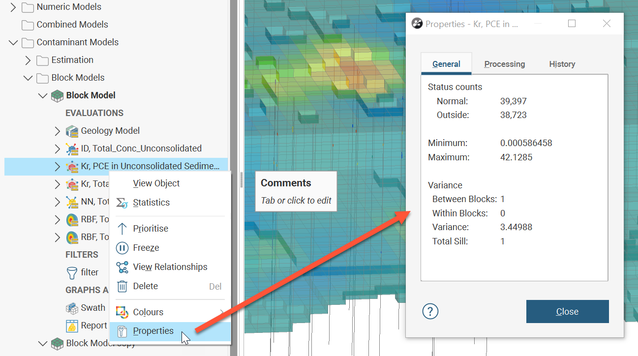 Separately, the block model evaluation object has a Properties window with useful statistics. One important section is the Variance section, providing the variance Between Blocks and Within Blocks, useful for calculations applying Krige’s Relationship and determining the variance correction factor and block dispersion variance.
