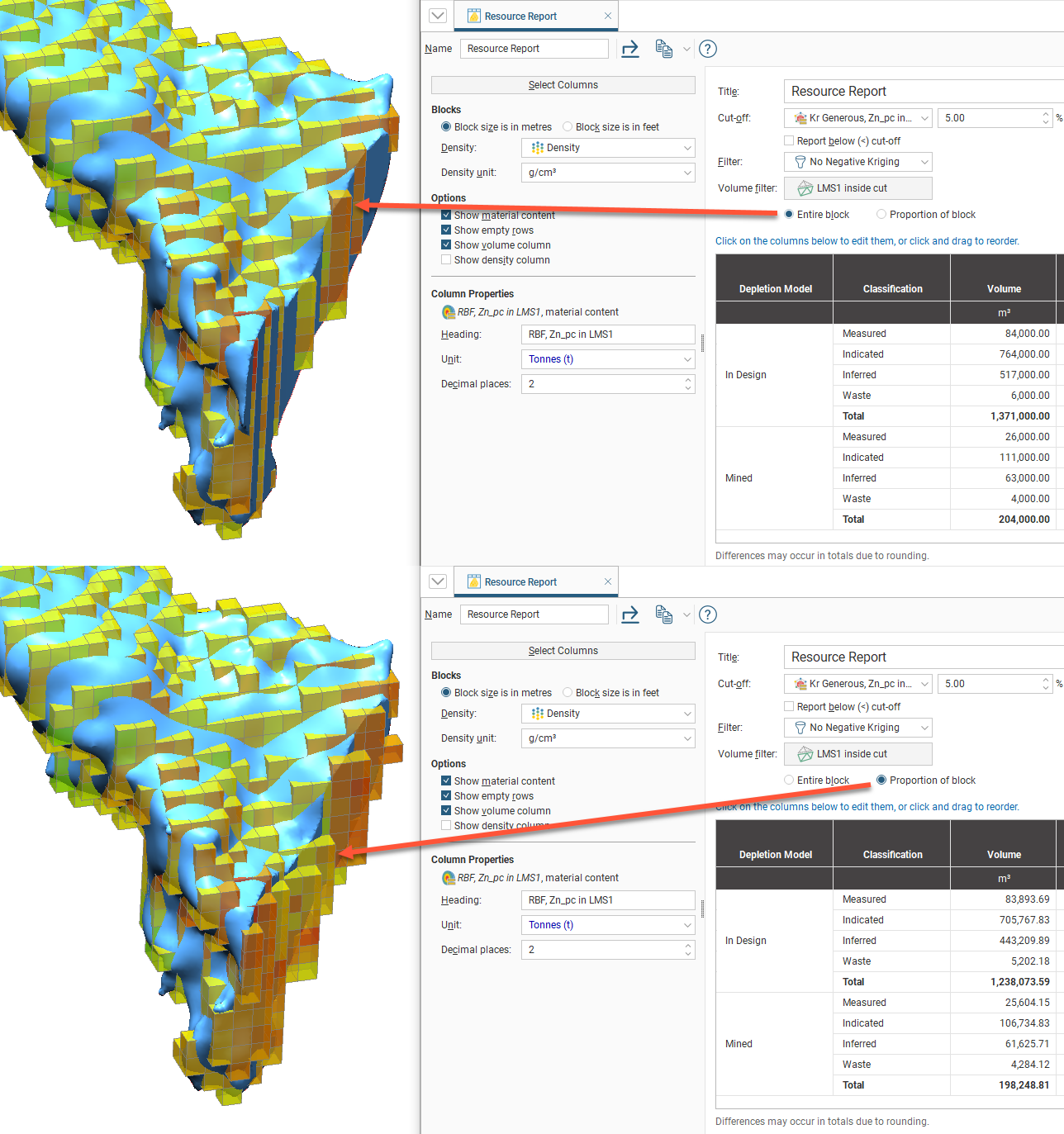 If you select one of the options in the Volume filter dropdown, only blocks within the selected volume will be reported on in the report. If Entire block is selected, an entire block will be included in the report as long as the block centroid is within the volume being used as a filter. If Proportion of block is selected, only the proportion of a block that is within the selected volume will contribute to the report.