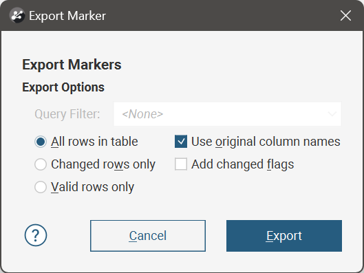 Right click on the marker table in the project tree and select Export. In the window that appears, select whether to export All rows in table, Changed rows only or Valid rows only. You can also choose to enable or disable the options Use original column names and Add changed flags.