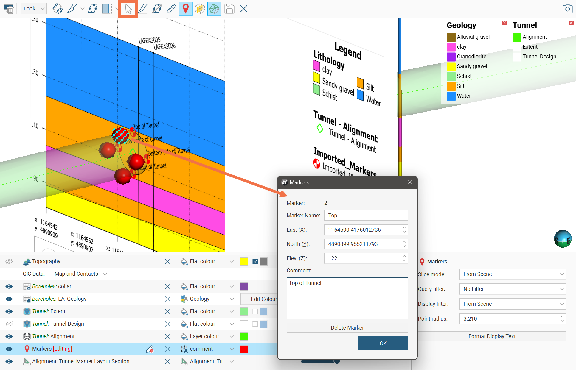 Markers are points that can be used to identify areas of interest in the scene. Markers can also be selected as objects projected onto section layouts and sections.