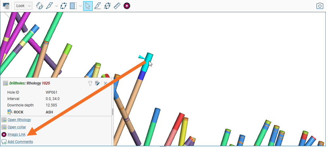 To view core photos, click on a borehole in the scene, then click on the Imago Link button in the window that appears: