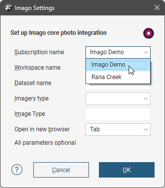 Each of the fields in this window must be set in order for Imago to display corresponding imagery when an Imago link is displayed. Once you have selected which subscription you wish to link to, choose a workspace, a dataset, an imagery type and an image type.