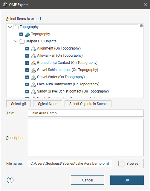 When you export objects in OMF format, you can select from the list of objects in the project. You can also select the objects that are currently in the scene, and so setting up a scene before initiating the export of an OMF file is a useful way of selecting a subset of data for export.