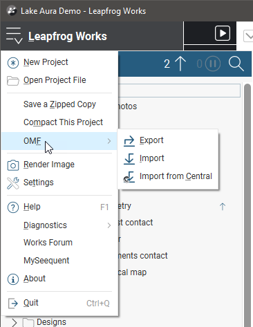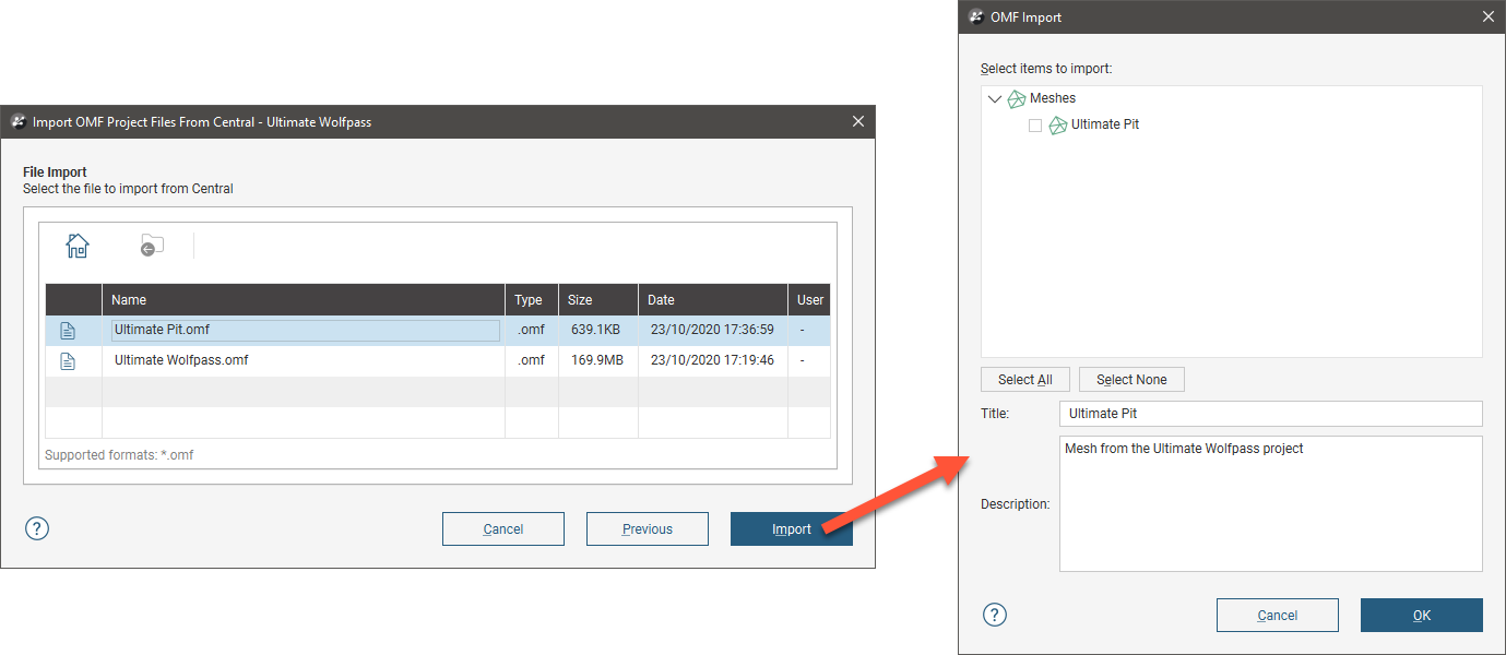 In order for OMF files to available for import to Central users, upload the OMF file to a Central project’s files. Here an OMF file in the Ultimate Wolfpass project’s files can be imported into Leapfrog projects on the same Central server: