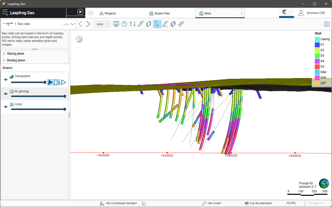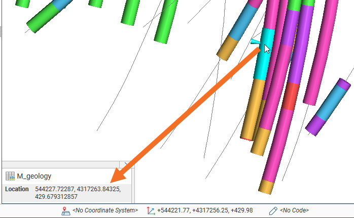 When you click on an object in the scene, a popup window will be displayed showing information about the object. If data was included when the scene was created, this will be displayed in the scene. For example, here we can see the selected data point’s location, identification, starting and ending points and lithology: