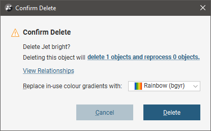 If you delete a colour gradient from the Colour Gradients folder and it is in use in the project, you will need to select a replacement gradient for all colourmaps that use that gradient. Select the replacement colour gradient from those available in the project:
