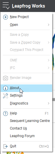 You can access your licence information by selecting About from the Leapfrog Works menu: