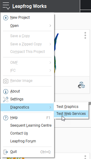 You can run a series of tests to check that your computer can connect to Seequent’s web services. To do this, either click the Test Web Services button in the Settings > Network window or click on the Leapfrog Works menu and select Diagnostics > Test Web Services: